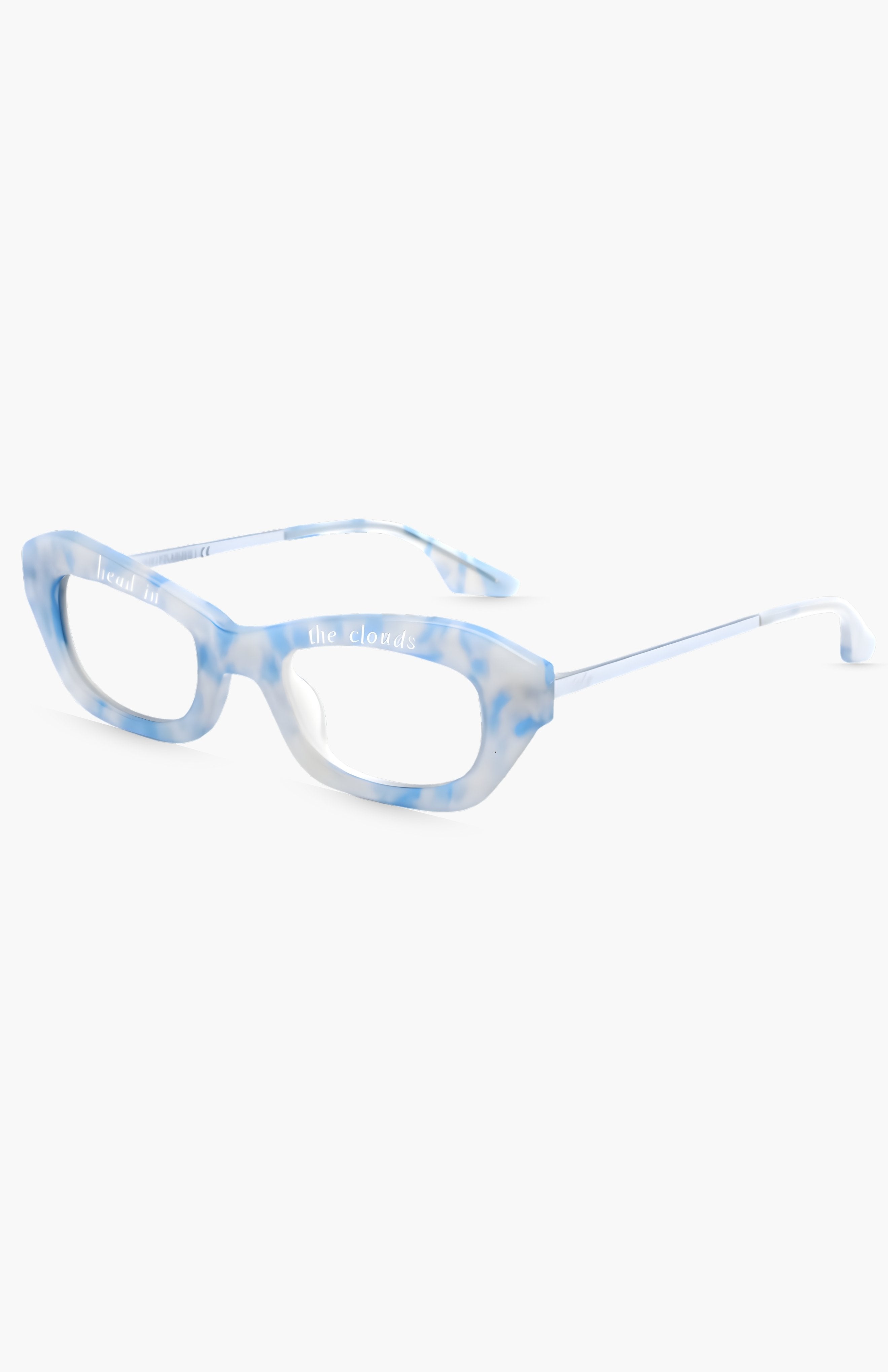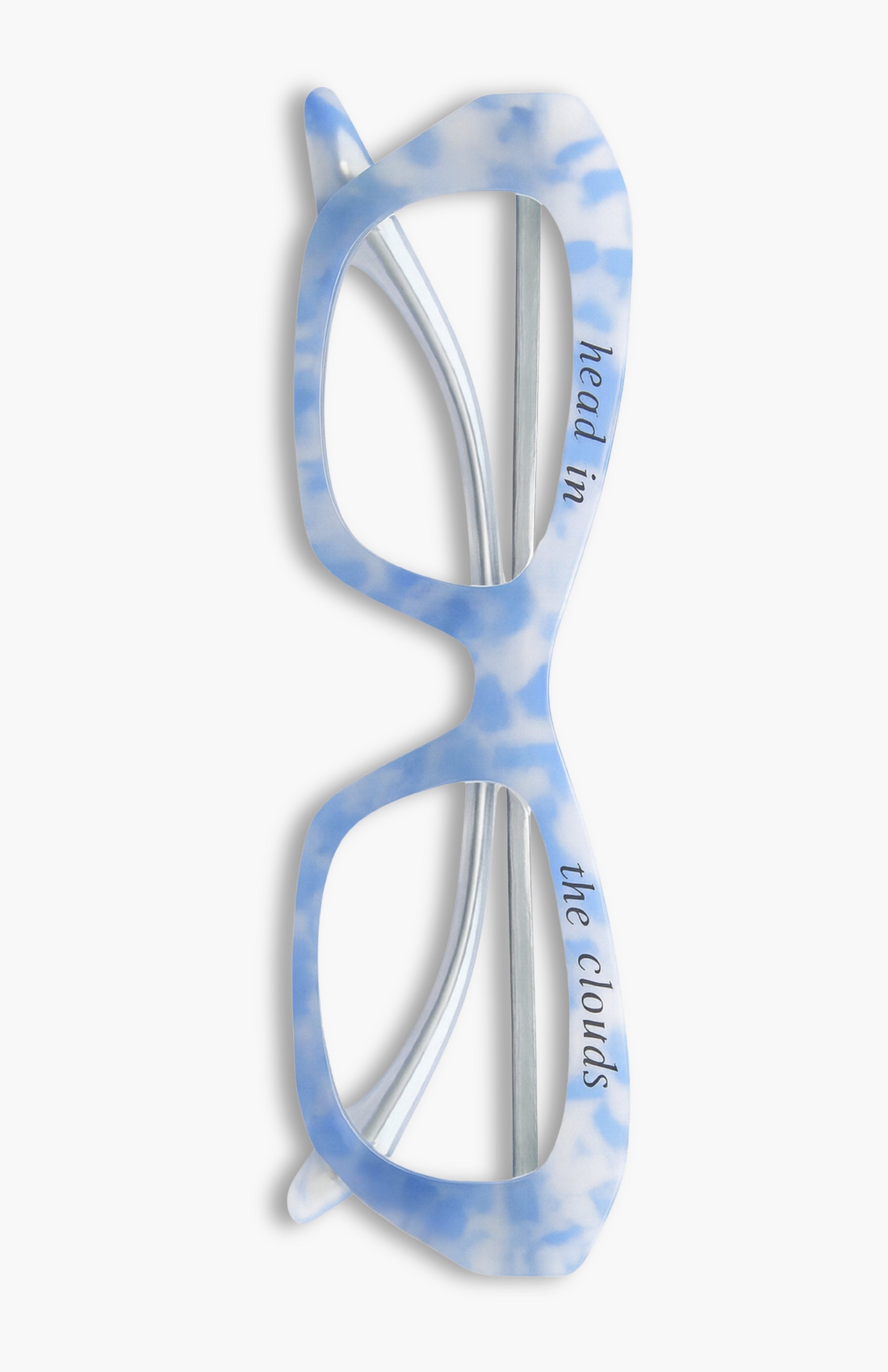Designed with daydreamers in mind, this timeless shape flaunts a beautiful blue and white cloud pattern and reflective silver "Head In The Clouds" wording that shines in certain lighting for an even dreamier effect. These are perfect for all face shapes.